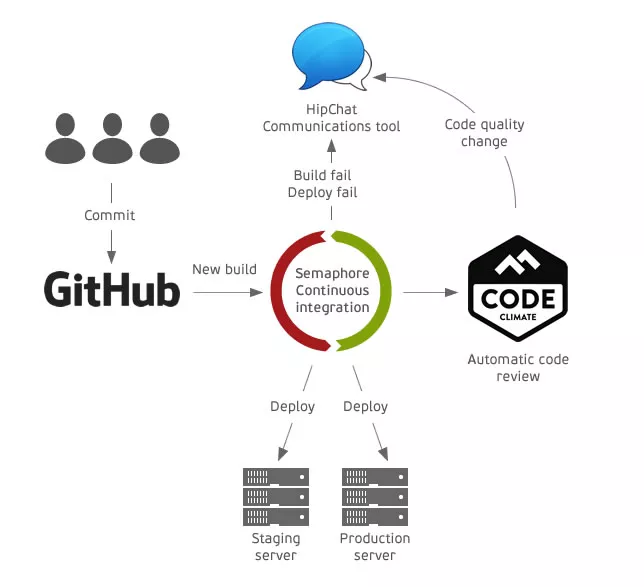 We’ve also integrated CodeClimate with HipChat so we receive notifications directly to HipChat rooms. Since we use Hipchat as our primary communication tool, the fact that Semaphore and CodeClimate are both integrated with it comes in really handy.