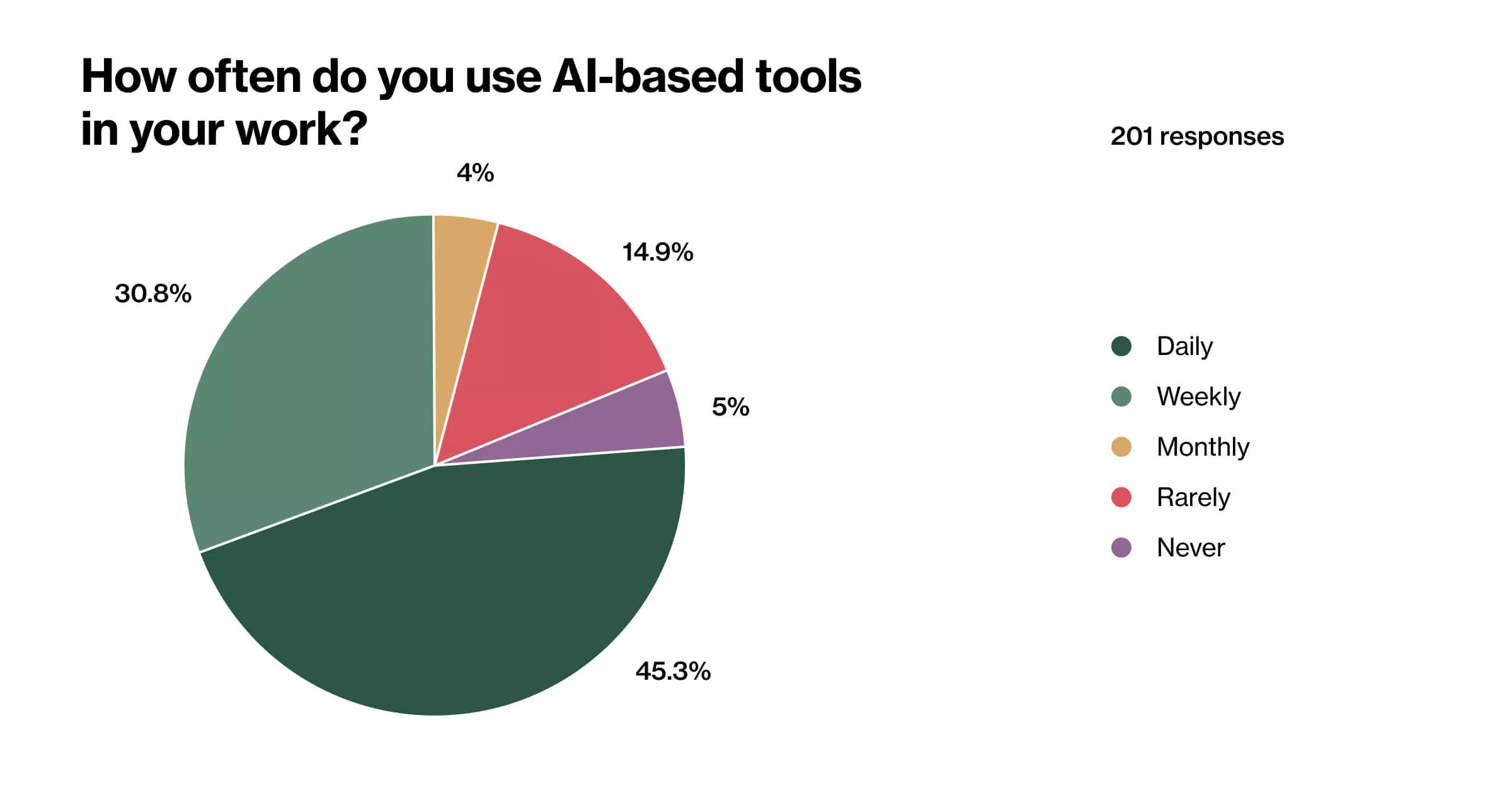 We recently conducted a survey across Infinum to get a high-level understanding of how we are using AI as a company and to find interesting use cases we could surface in this article. Here are some high-level stats from the 201 respondents.