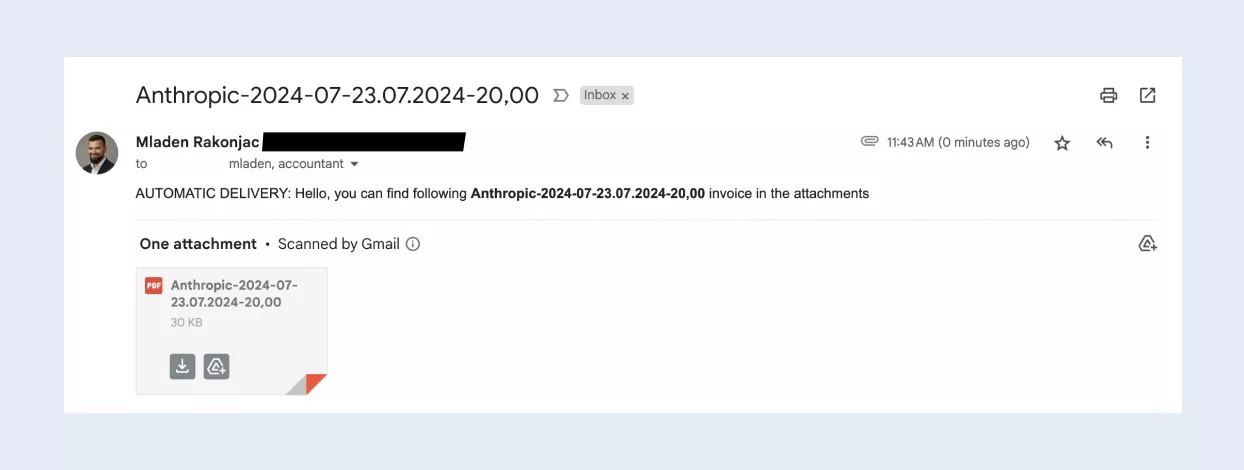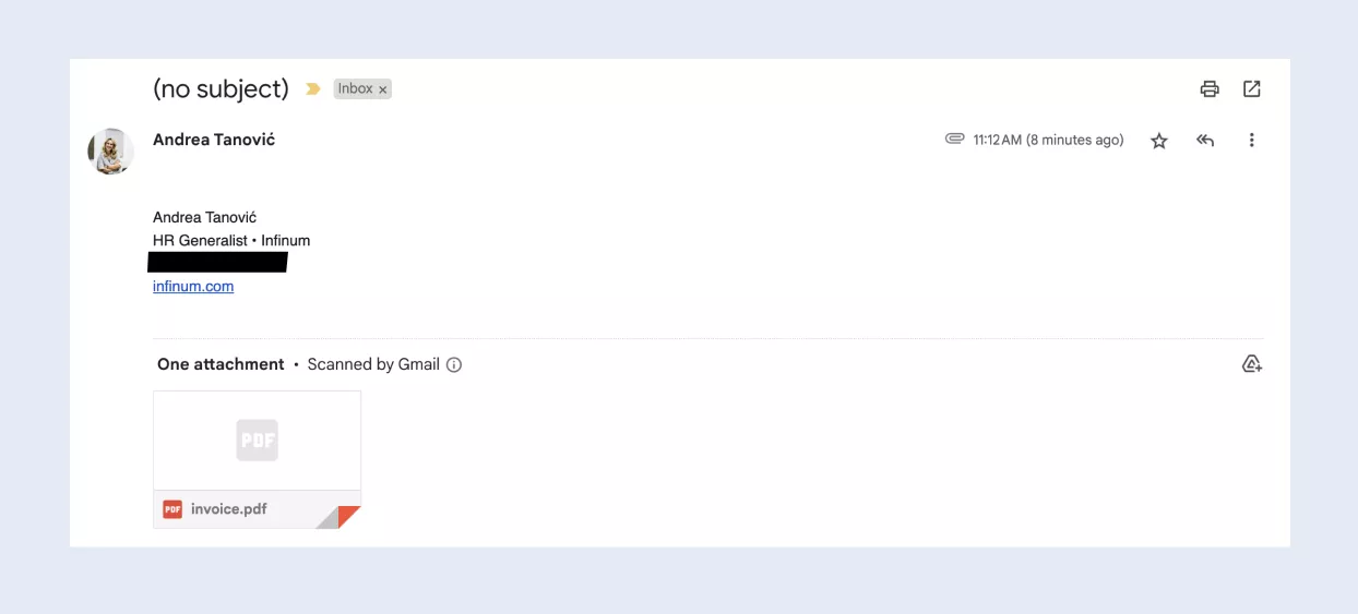 For this purpose, we created a special email list, montenegro.invoices.import@infinum.com. All incoming invoices should be sent as attachments to this list. The hourly script we’ve created will search for each email thread sent to it. For increased security, we can also limit our search only to emails sent from specific email addresses. That way, we’ll only get invoices from senders we know and trust. In this example, we’ll use the address approved.sender@infinum.com.