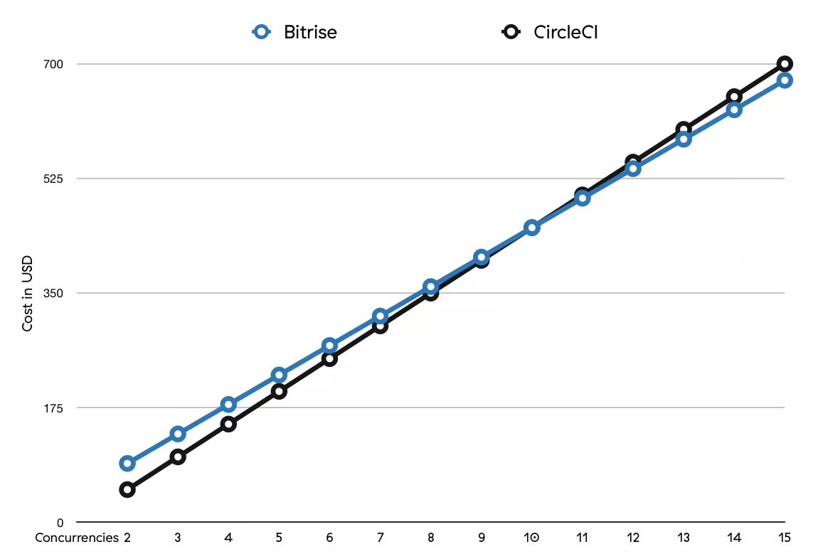 For concurrencies, both Bitrise and Circle have similar pricing: