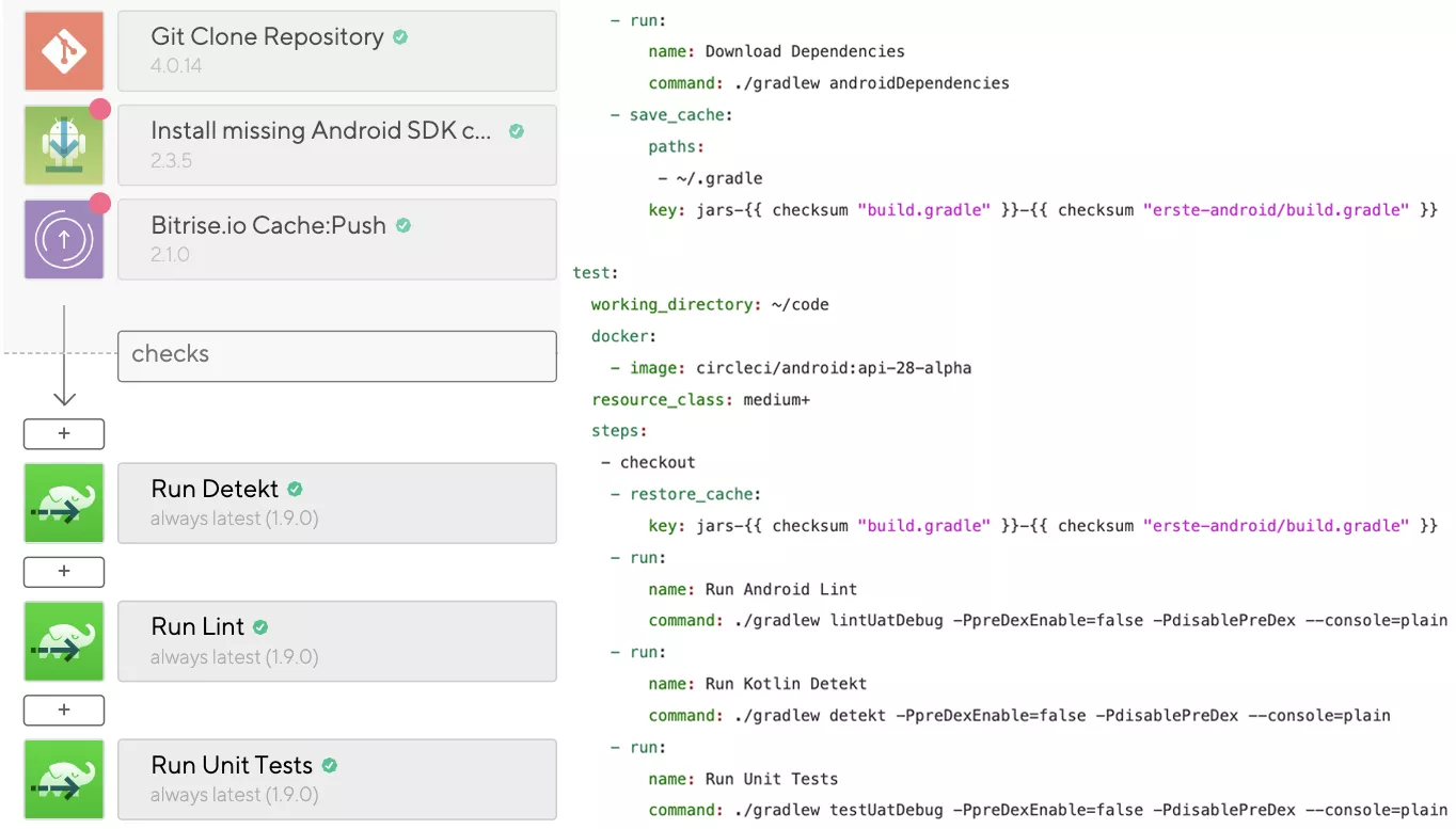 For some projects, we need to build several flavors of application. For these, we use parallel builds. Both Bitrise and CircleCI support parallel builds and are easy to set up. For Bitrise, you would have one workflow that initiates all the parallel workflows and waits for them to finish. This way, one container will always be used just to wait for others, which is not the case on CircleCI. That’s a plus for Circle!