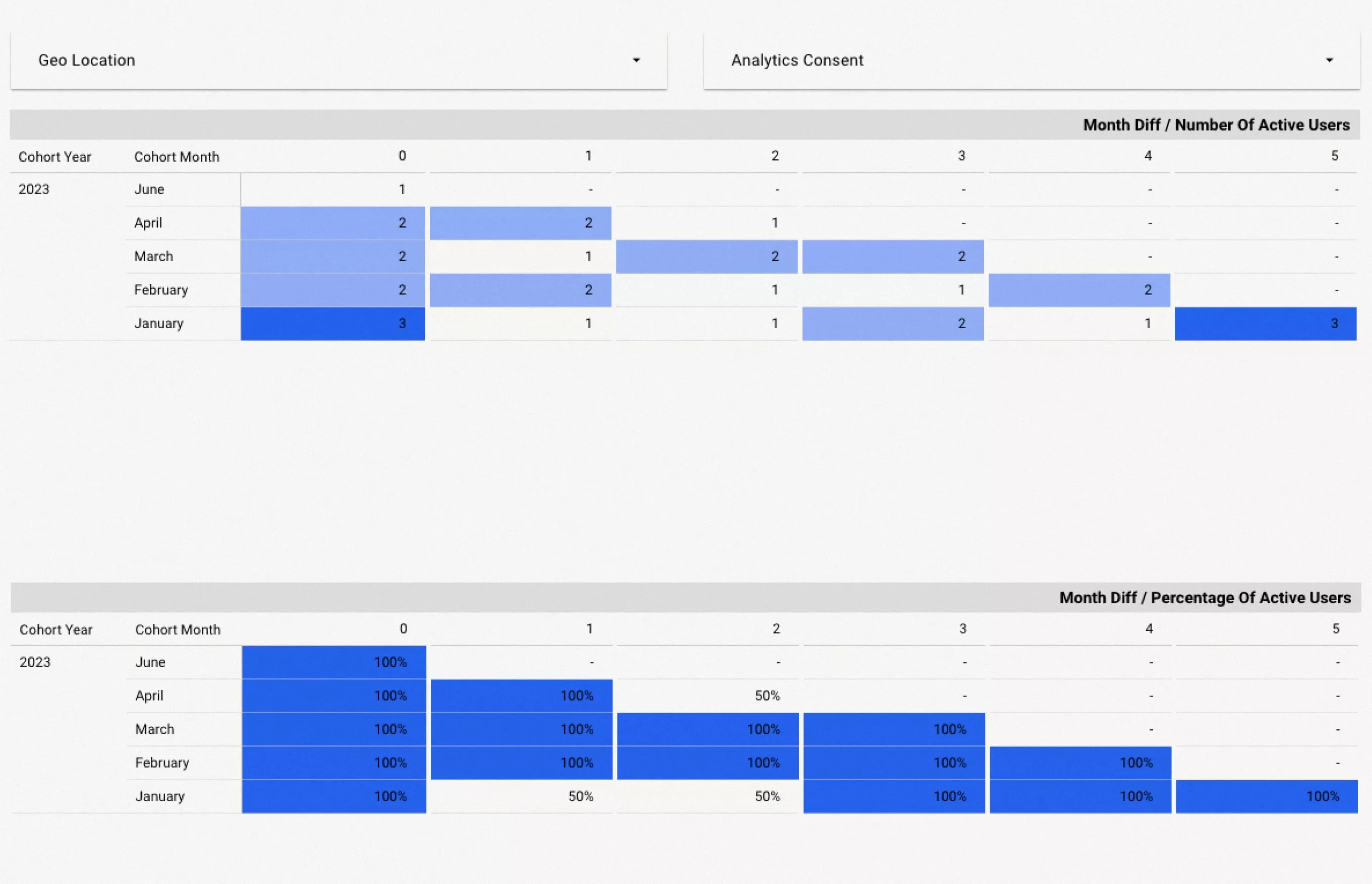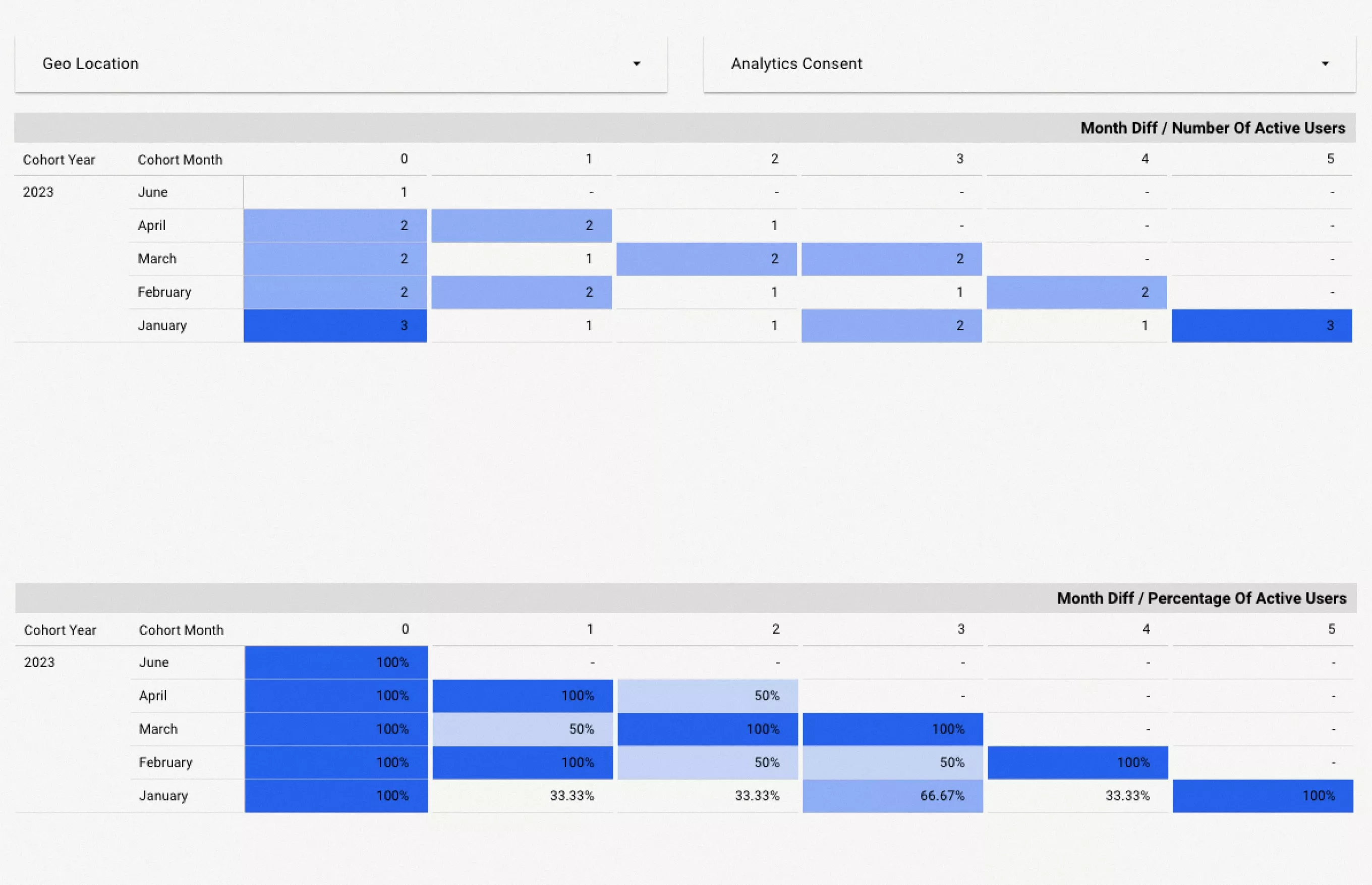 Let’s say in January we gained 100 new users. A customer retention dashboard will tell us how many users out of those 100 are still active in February, March, and the following months (see the image below). This can be very useful when we want to know if we are actually meeting users’ needs and how active they are.