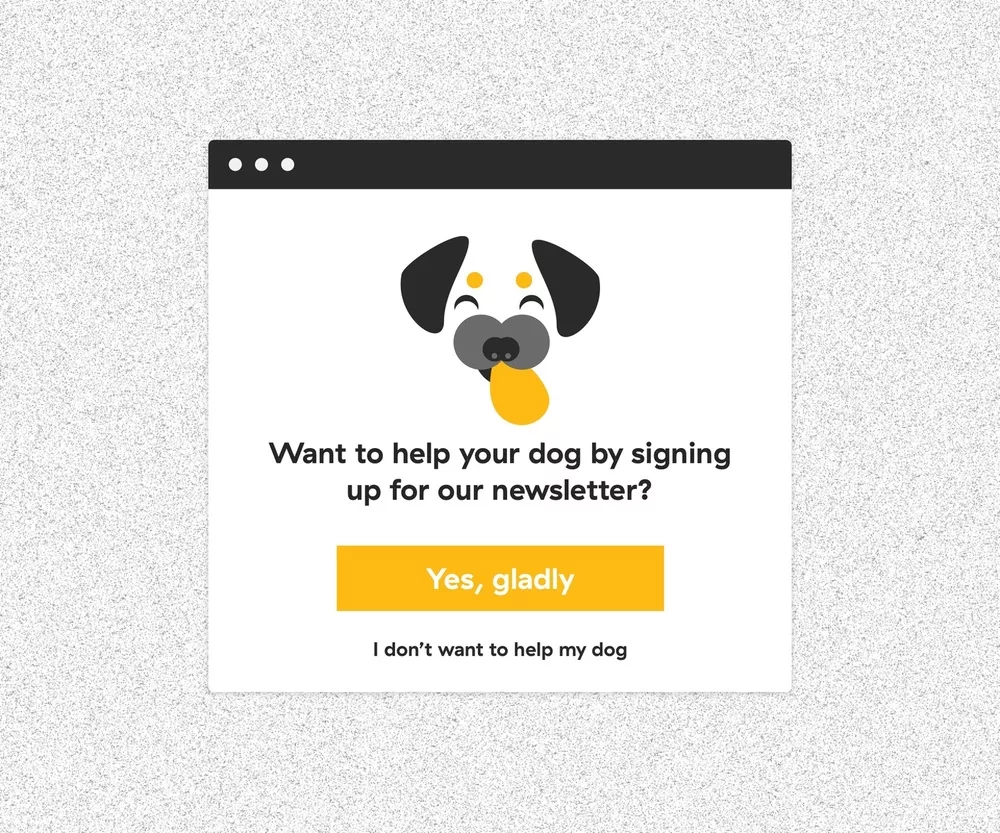 This is the act of guilting the user for not choosing a suggested option. The content is written in a way to shame the user and make them feel bad for not signing up for a newsletter or some other desired option.
