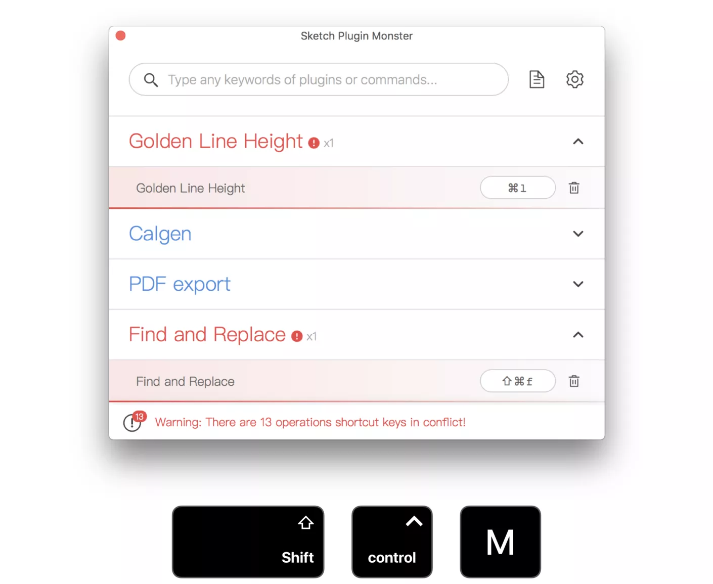 After you’ve installed all the above-mentioned plugins, the first problem will be shortcut conflicts. Sketch Plugin Monster helps you solve this problem in a very simple way. You can see all the conflicts and easily change shortcuts. There’s also an option to export/import all the shortcuts.