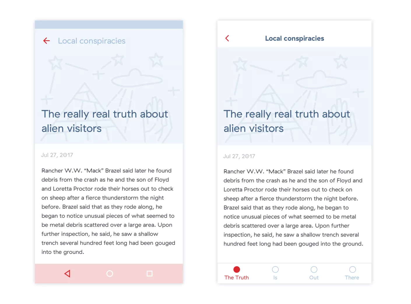 The general goal of a multi-platform mobile design is to achieve both brand consistency and alignment with platform-specific conventions. But, the only way to truly ensure style and layout consistency across various platform versions, manufacturers, screen sizes and densities is by using custom UI components. When going custom, you are always risking creating something that doesn’t feel “at home” to the user.