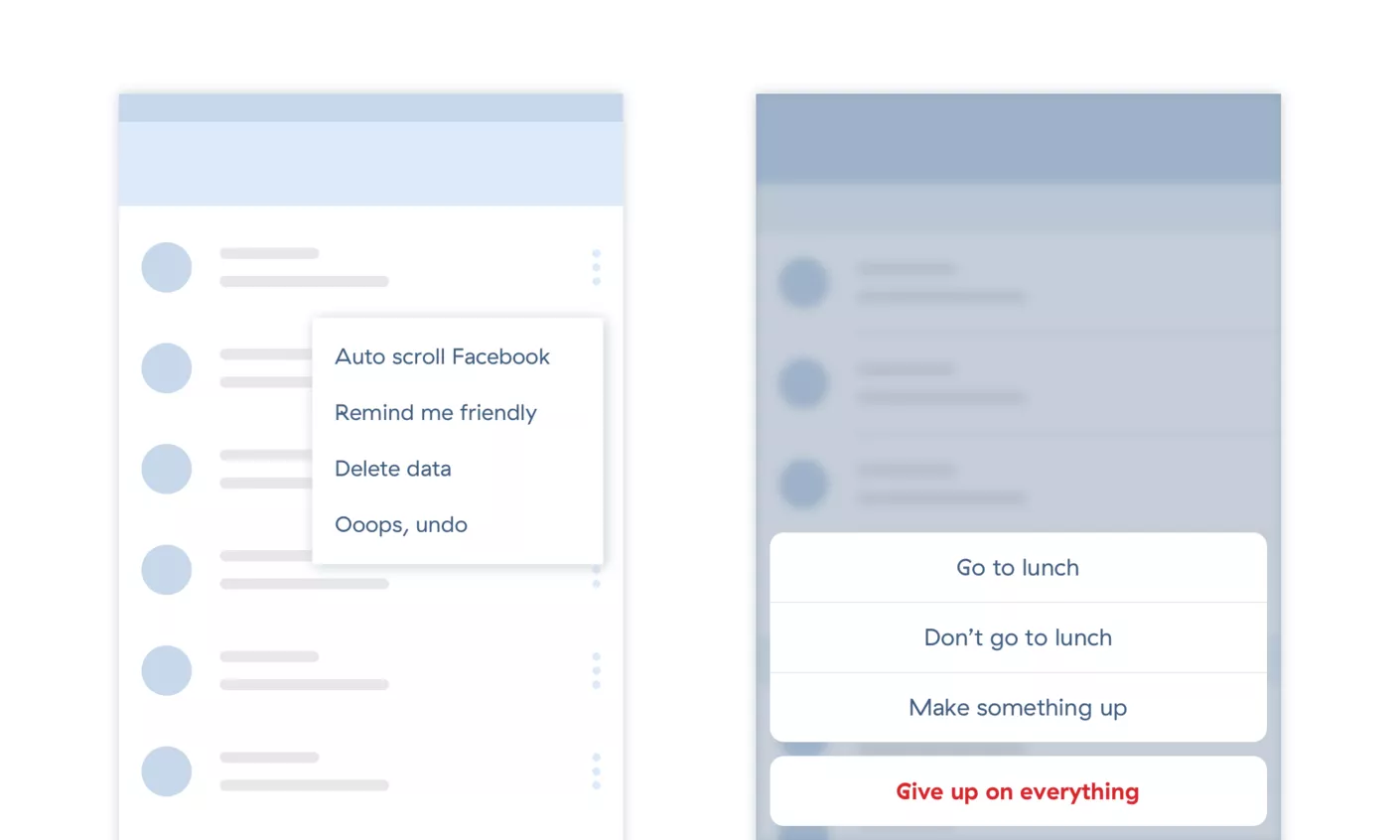iOS has a different approach. Whenever possible, all the actions should be visible. If there are too many related actions, then these can be found beneath the list item, discoverable by swiping, or placed behind the “more” option which reveals an action sheet containing all the actions.