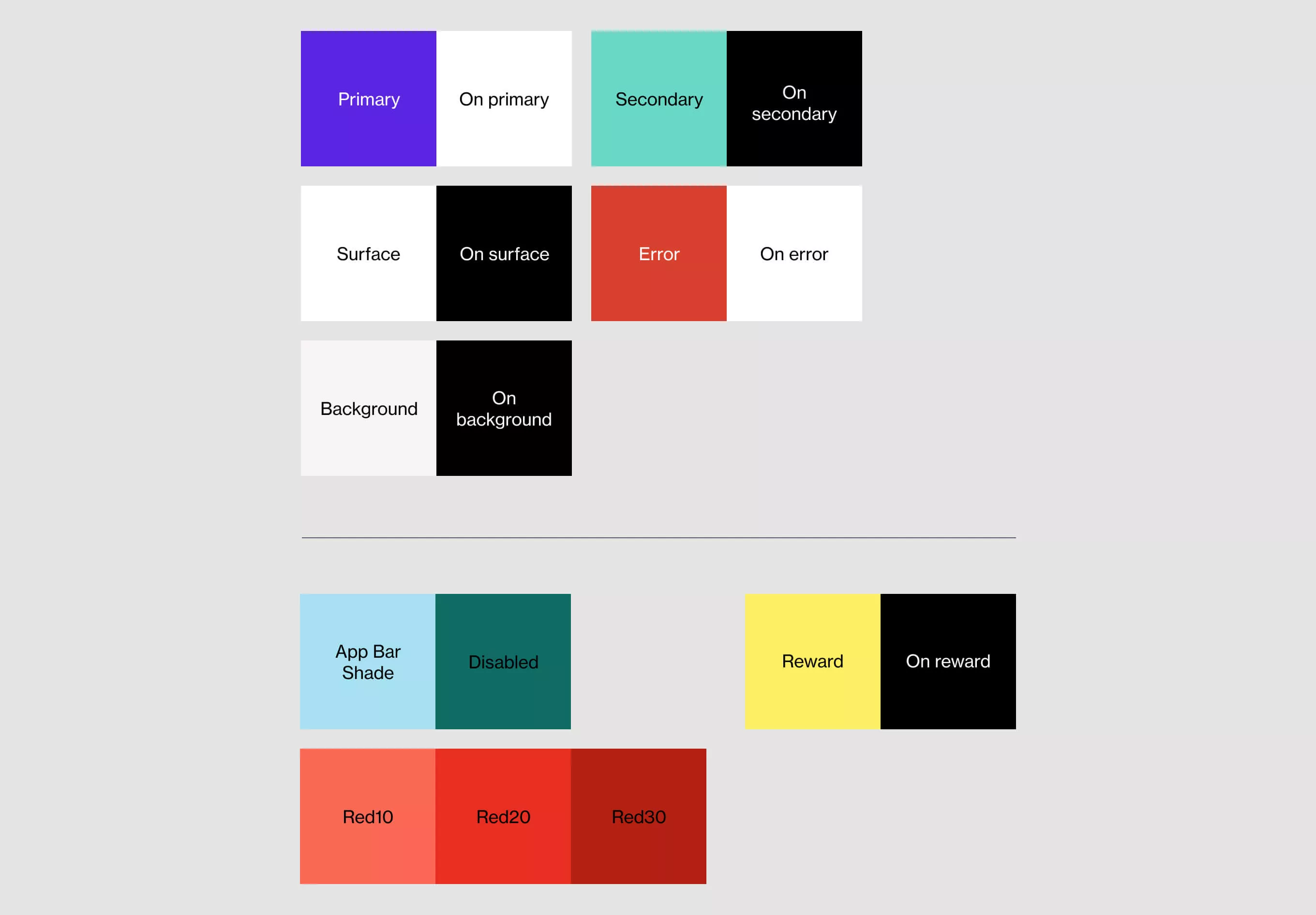 The colors in Material schemes come in pairs. First, there is the color itself, and then there’s the color of text or other content on that color.
