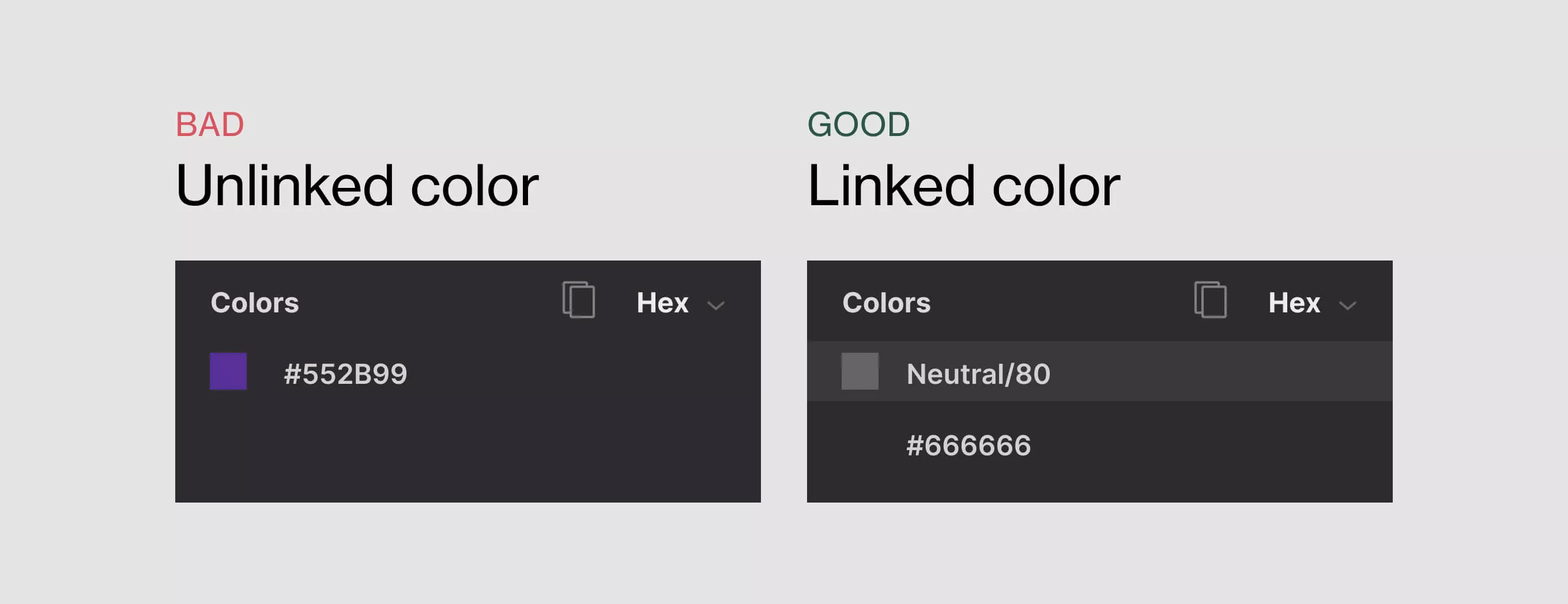 There should be no unlinked colors in Figma since the developer will not be implementing the hex values directly to the screen. All the colors need to be linked so that the developer can read only the names.
