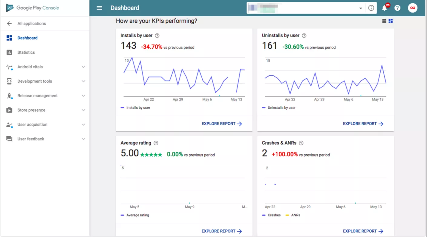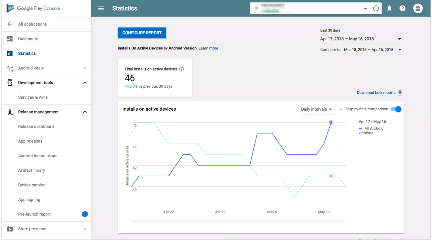 GPC offers a tool for configuring reports, which allows you to compare several different metrics and break them down by dimensions. For example, you can find out how many people installed or uninstalled the app in a certain period of time, how many crashes were logged per Android version, how big the DAU/MAU is on newly released versions, etc. All of these metrics will help you get a better overview of how your app is performing. (While we are fully aware that there are other analytics tools out there that do a much better job than either of these consoles, we are focused only on iTC and GPC for this article.)