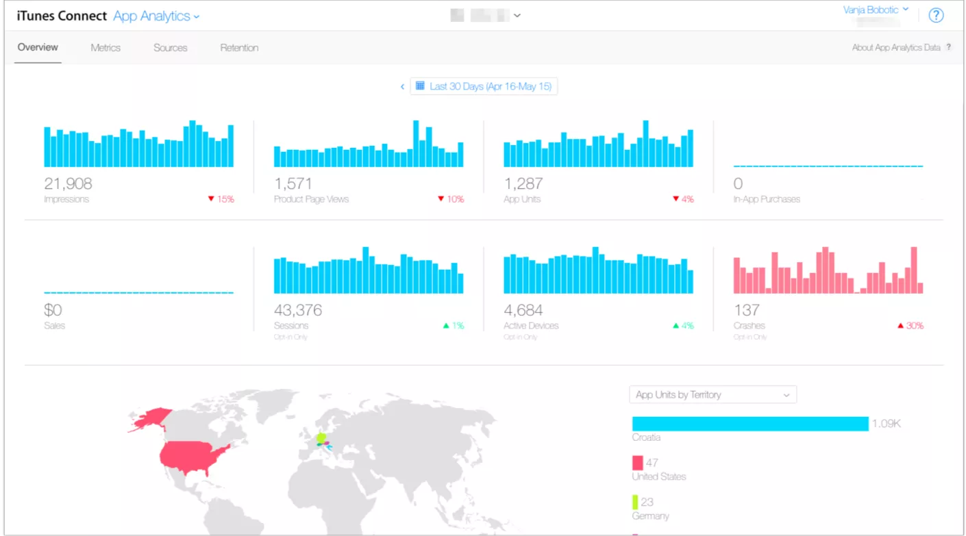 Apple always has a clear vision when it comes to design, and this certainly carries over to iTC statistics. In iTC, the stats screen features a basic overview of user engagement, App Store impressions, crash reports, and marketing campaigns. However, it is not configurable and offers little insight into your app’s all-round well-being.