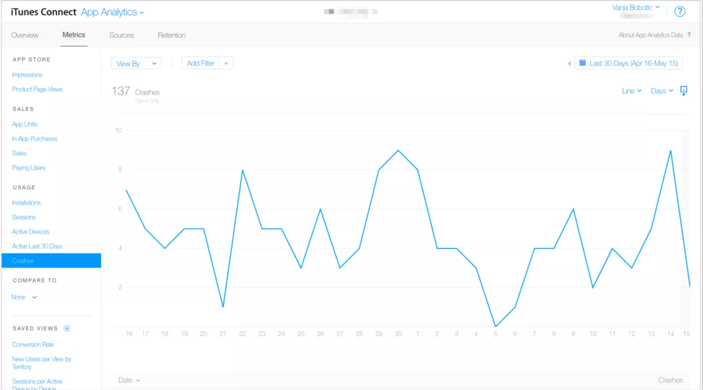 In App Analytics, you will find a basic crash report with crashes that occurred in the last 30 days and the percentage of affected users. If you want to learn more, you can move to the next screen, which offers the exact number of crashes by date with an option to include additional filters such as app/platform/device versions.