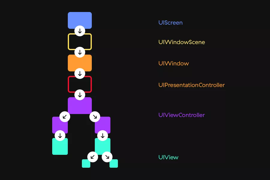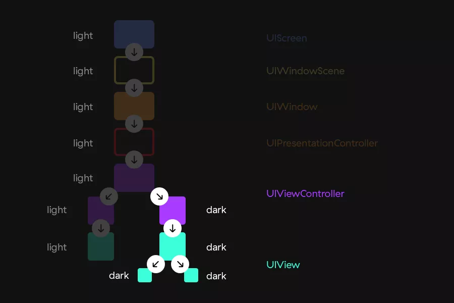 This propagation means that the theme which should be used is not being read from the system on each hierarchical level, which allows us to override system appearance mode whenever we choose. For example, we can define a different interface style for just one view controller inside our app, and that style is then passed onto each of its child views, while unrelated views remain unaffected.