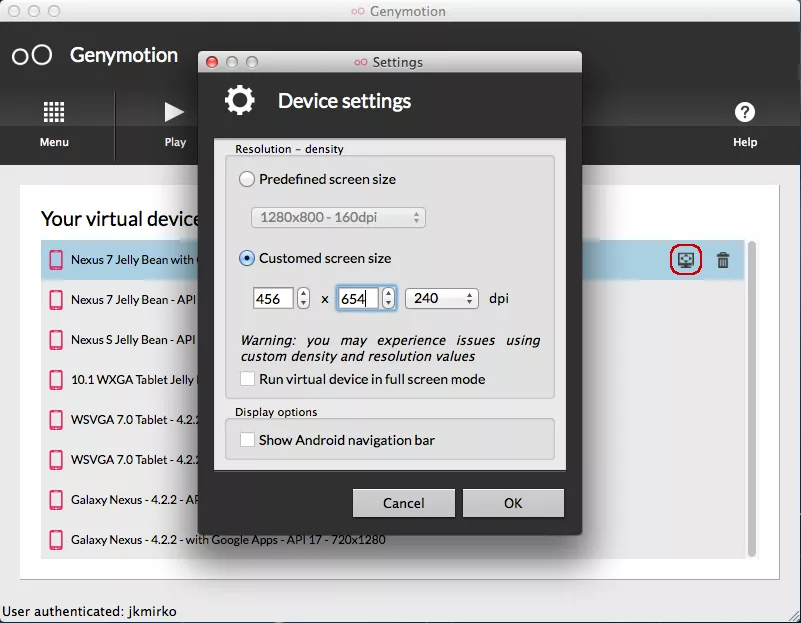 Genymotion, as well as the default emulator, offers custom configuration of device’s screen. In the list of available devices, select the device for which you want to change screen configuration and click on the monitor icon on the right side. Then simply select one of the predefined screen resolutions or create your own.