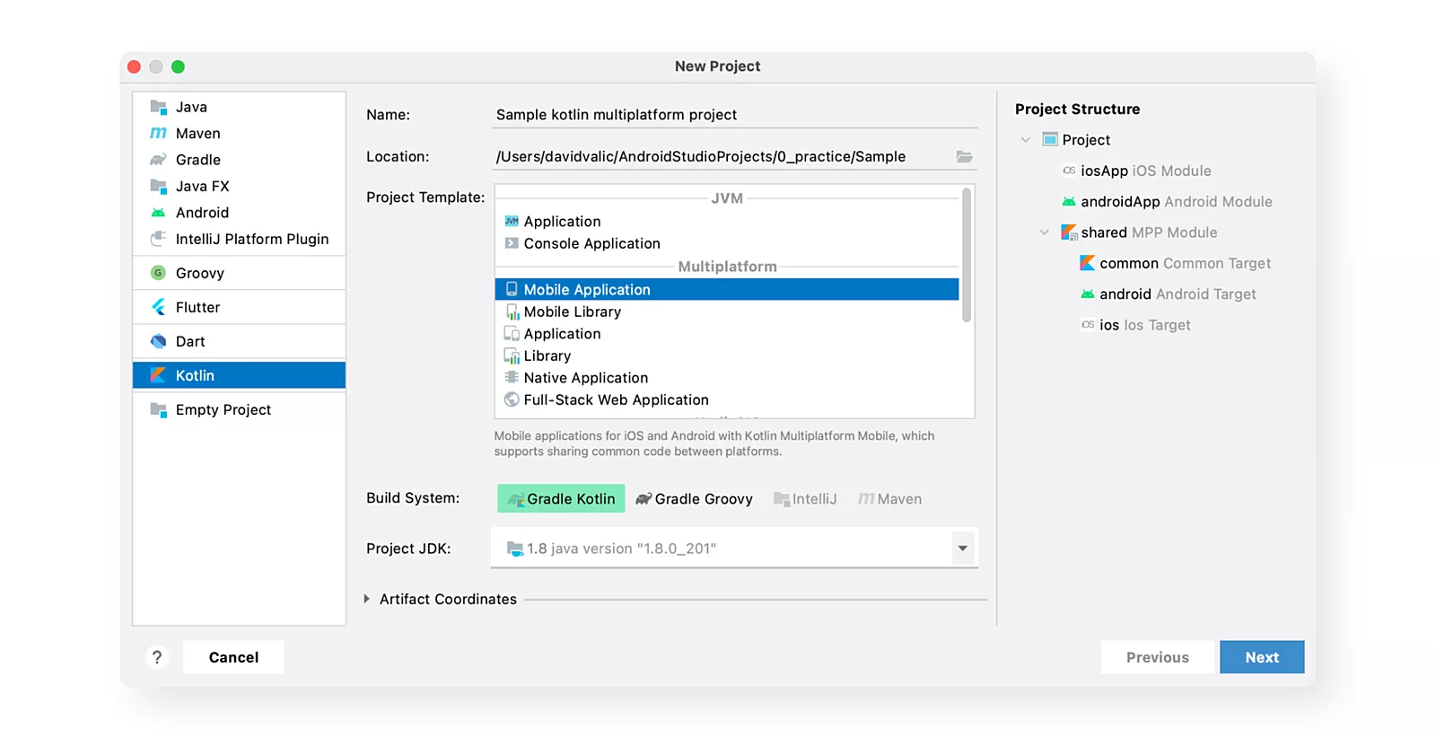 The easiest way to start a project with Kotlin Multiplatform Mobile is to use JetBrains Intellij IDEA and start a new Kotlin project from the multiplatform section.
