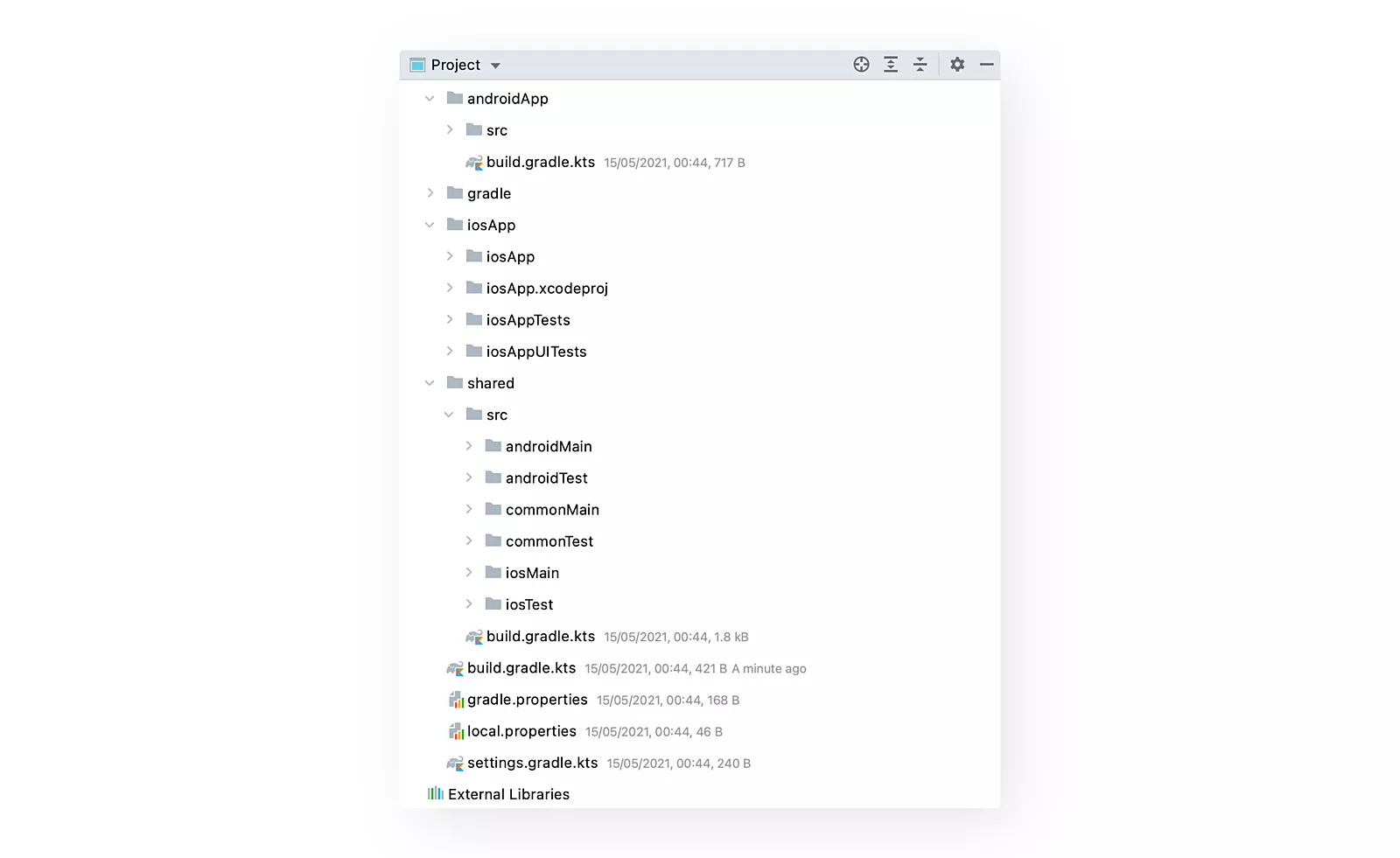 A newly created project has the structure shown above. The androidApp package is your standard Android app that includes the manifest, resource and main code directories. The largest part of this package should be the Android UI part (the Activities, Fragments, Views, etc.).