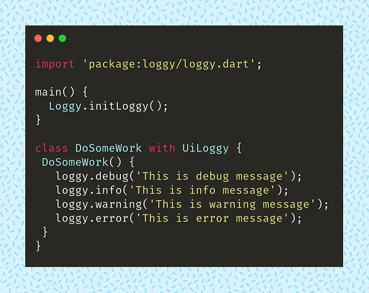 To use Loggy, simply add Loggy.initLoggy() before runApp(), and add with UiLoggy in any class where you need Loggy. That being done, it’s now time to log the messages loggy.debug, loggy.info, loggy.warning or loggy.error.