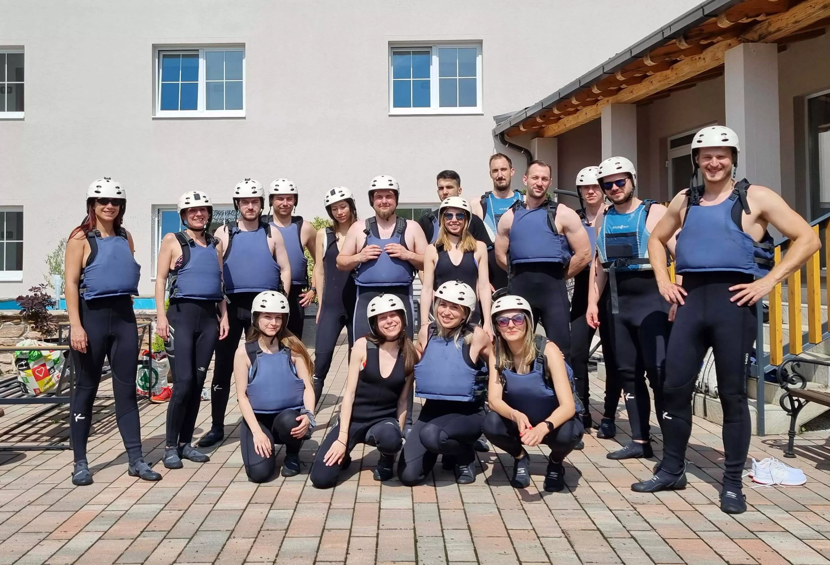 We love to eat and chill, so sometimes we gather for team dinner and drinks. We love water activities, so one year we went rafting and the year before we had a party by the pool. Hey, it counts!
