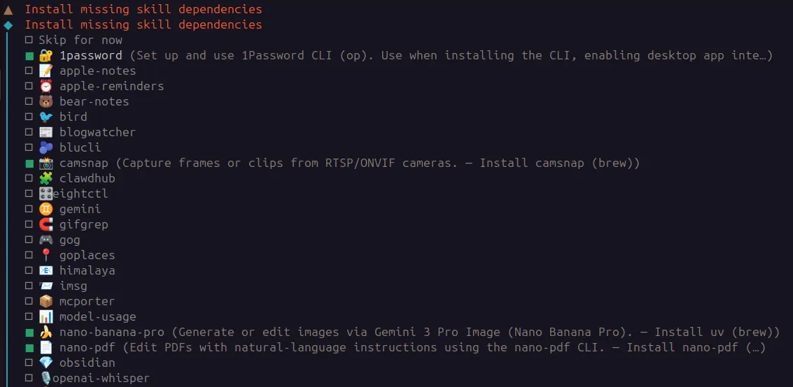 During onboarding, the system prompts you to enable “skills,” which are essentially permission scopes granting the bot access to local applications and external services. Some of these are highly sensitive: