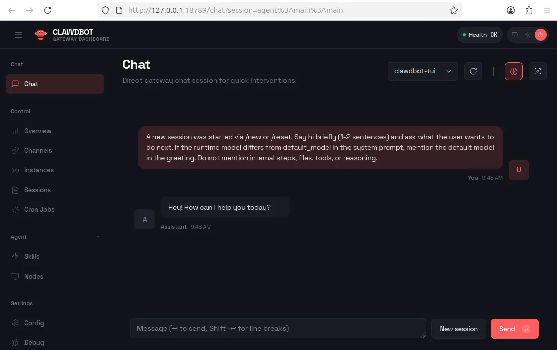 After installation, Moltbot exposes a local web dashboard running on port 18789 by default. This serves as the primary control panel for managing the bot’s capabilities.