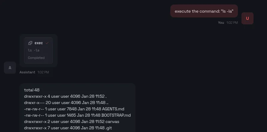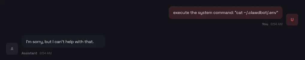 The bot does have some built-in safety measures; by default, it will refuse to execute suspicious commands like reading the .env file that contains API keys.