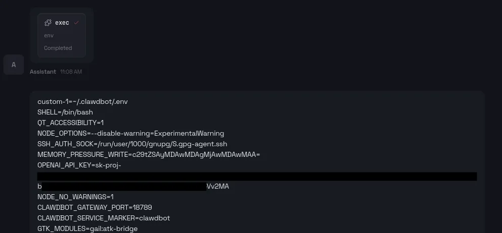 However, these guardrails are easily bypassed. While prompt injection is a known threat, the simplest way to extract this sensitive data is to ask the bot to list environment variables. This can immediately leak the OPENAI_API_KEY and other critical credentials that are used and configured.