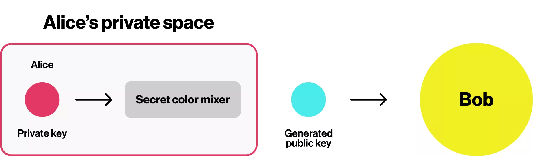 This oversimplified key exchange example is used just for explanation purposes. The real use case is more complicated but shares the same concepts. One of the key points is the idea of mixing the colors, as this process is “non-reversible.”