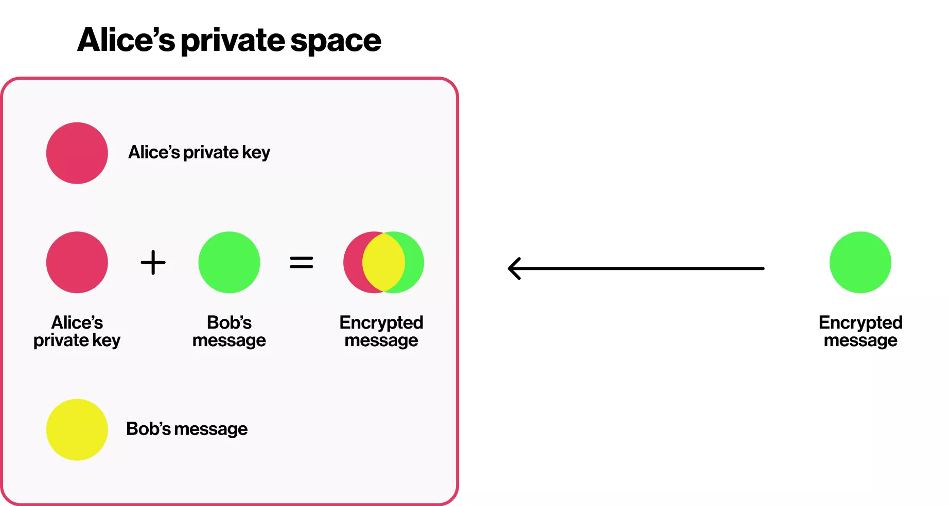 Step 3: Alice adds her private red color to the mixture, and since this is a complementary color to the cyan, it cancels the cyan out, leaving the clear yellow color – Bob’s message.