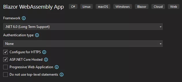 If we choose Blazor WASM ASP.NET Core Hosted, the Blazor client and the backend code are hosted on the same website. On the other hand, with the standard Blazor WASM option, the backend app doesn’t have to be ASP.NET Core. It can be anything, hosted anywhere.