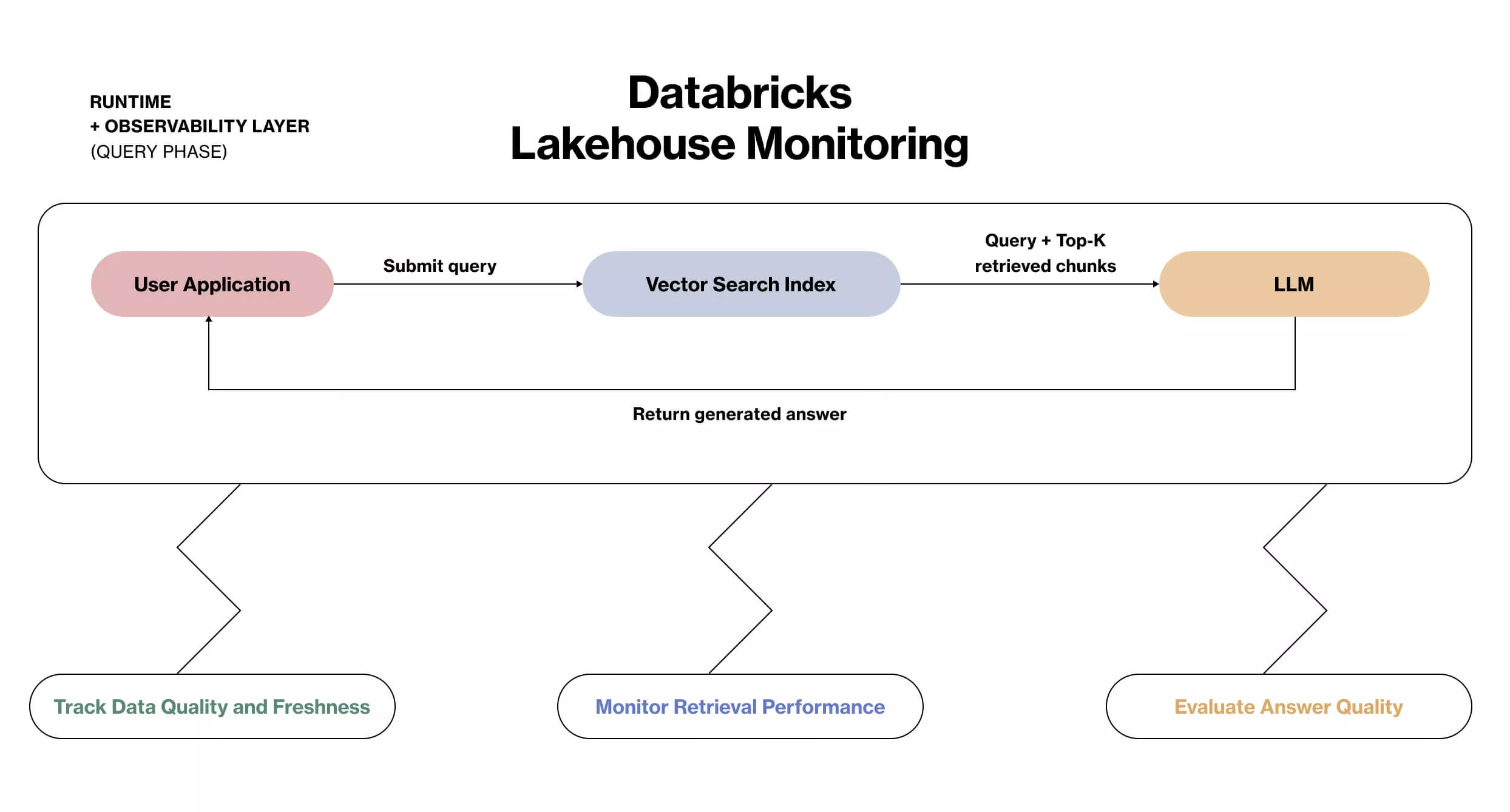 A user query is enriched with relevant context from Vector Search, answered by a large language model, and continuously evaluated through Lakehouse Monitoring to ensure data quality, retrieval relevance, and response reliability.