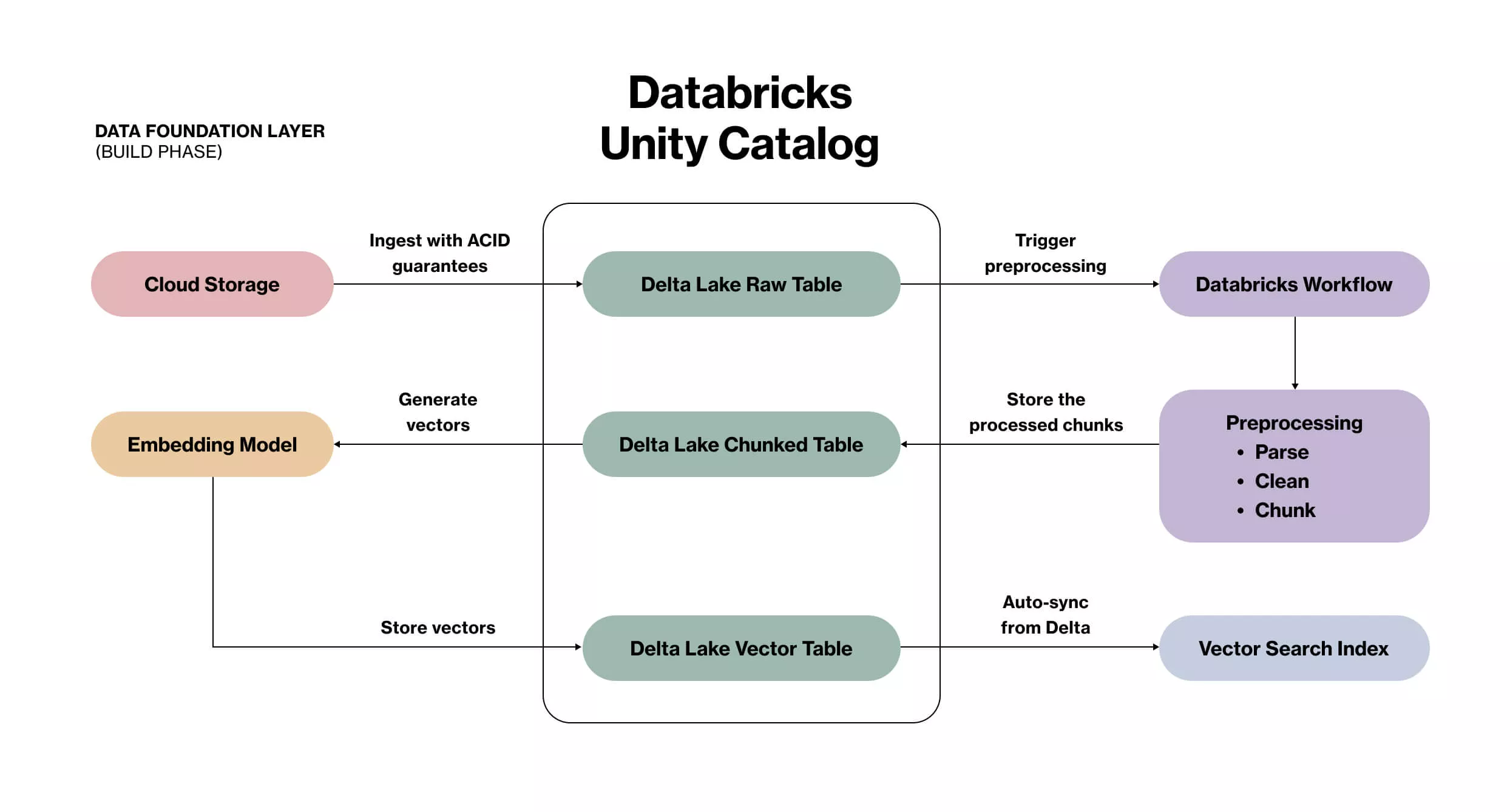 Unity Catalog handles governance, Delta Lake tracks every version from raw files to embeddings, and Databricks Vector Search continuously syncs with your data as it changes.