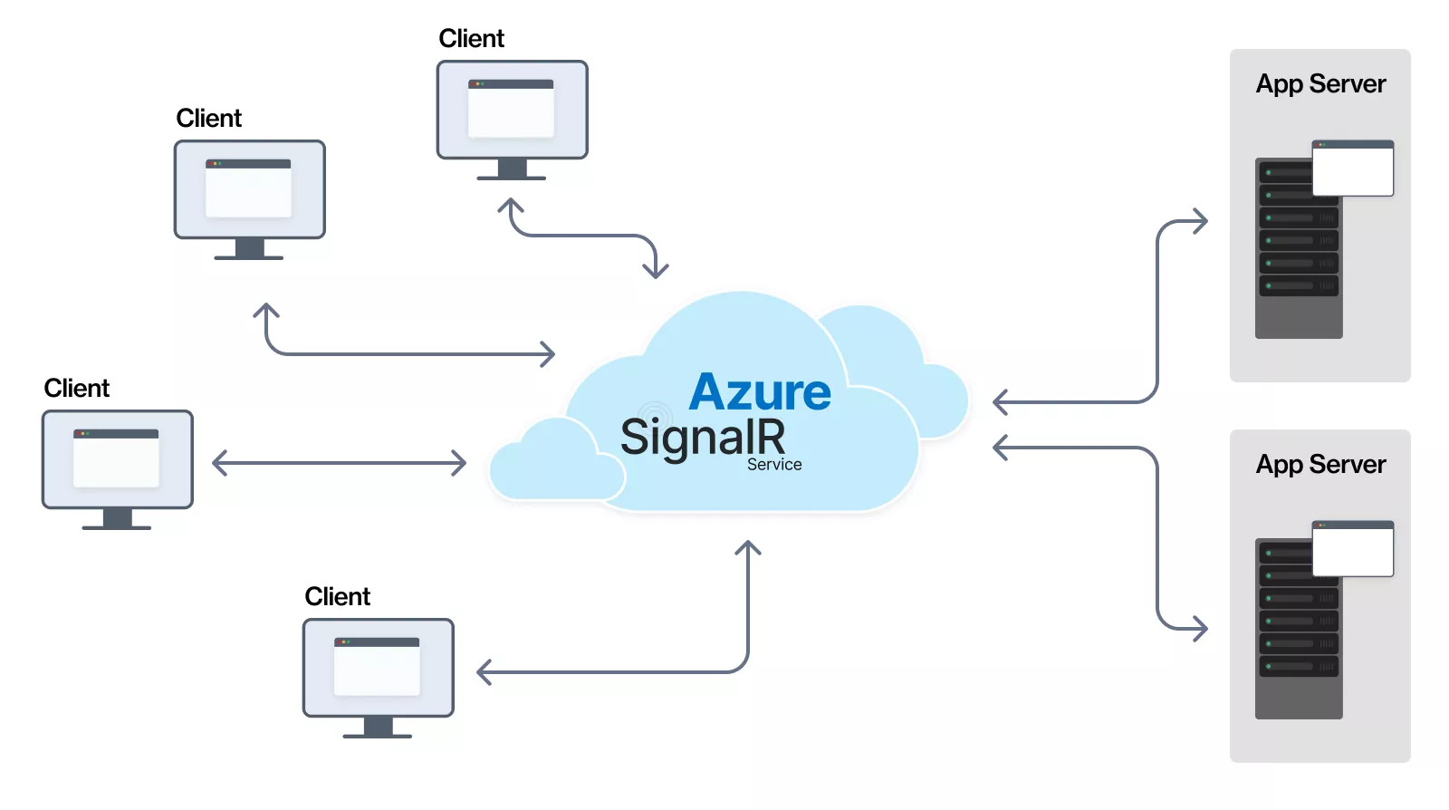 SignalR service works as a proxy for real-time traffic in such a way that when a client initiates a connection to the server, the app redirects the client to connect to the service instead. The service will then manage all client connections and automatically route those messages with each server having only a small number of connections to the service. The SignalR service handles the clients to connect the WebSockets to itself and not directly to the app.