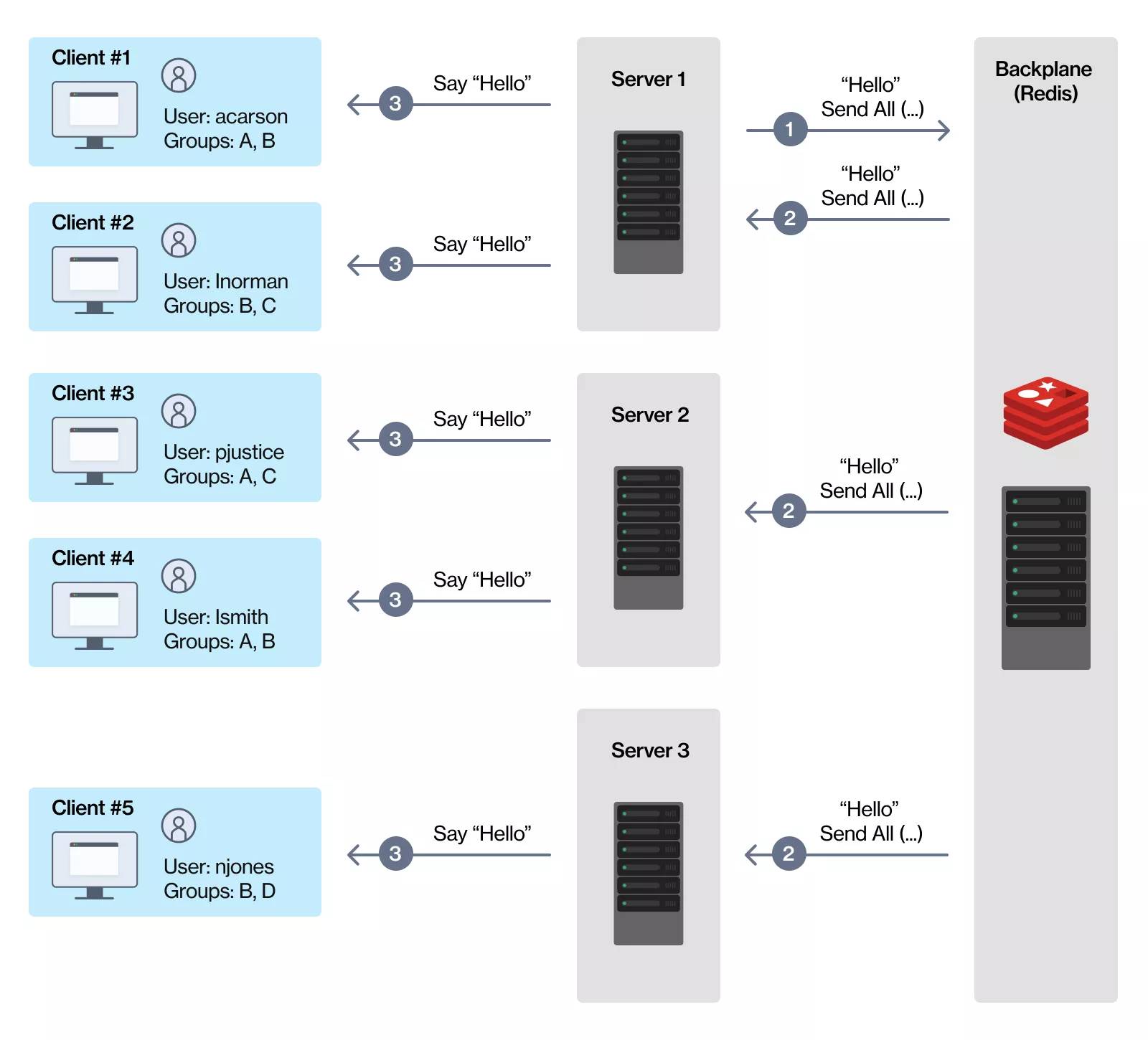 The code above sets the connection string with the option to add your own custom configuration in the appsettings.json file. And that’s it! The backplane will know about the connected clients and their corresponding servers.