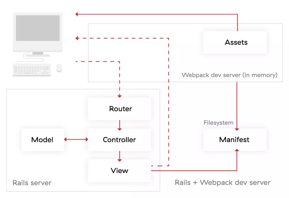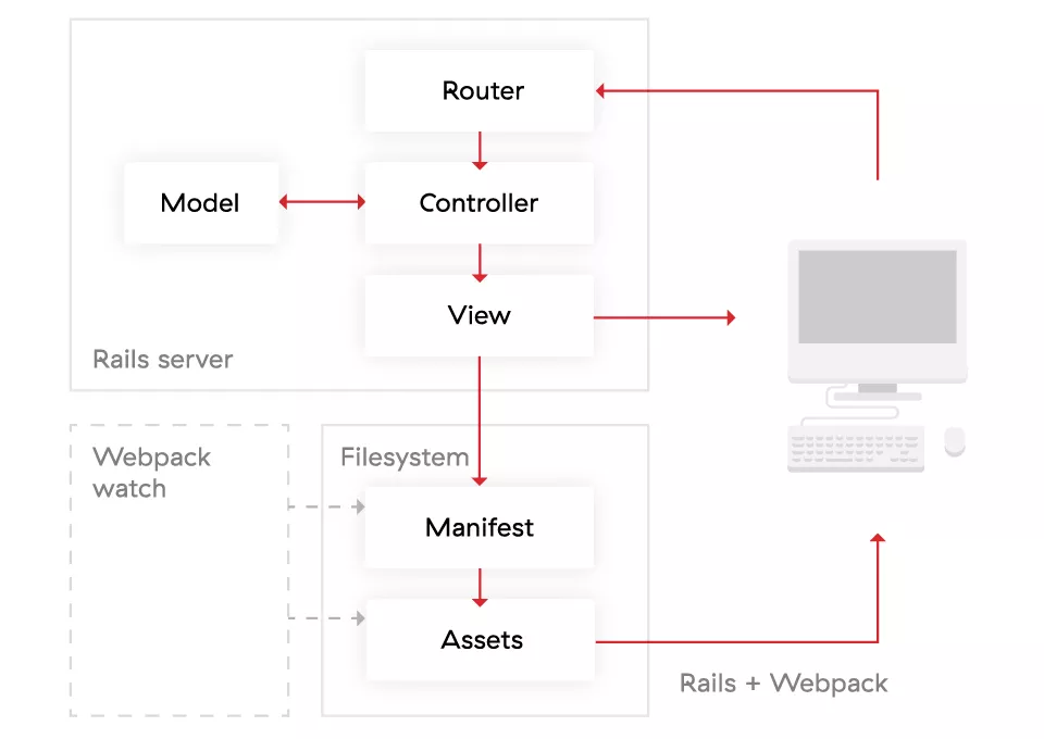 The only thing Ruby on Rails needs to do is to replace the assets helpers. This can be done in one of two ways (depending on your preferences). In both cases, you should remove Rails sprockets because they will not be used, and you won’t be able to use their methods by mistake. The easiest way to do this is with the following command when you’re creating your app: