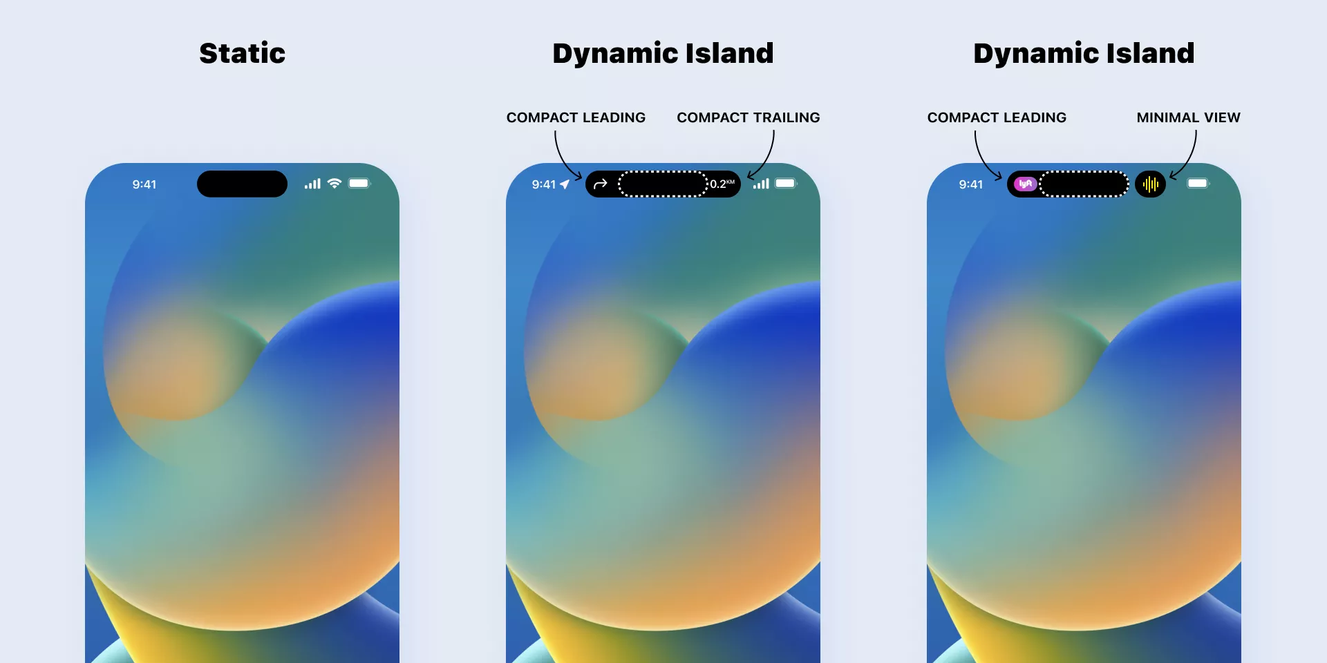 Designing for the Dynamic Island means designing for all possible views, from minimal to expanded, because there are three different ways Live Activities can be displayed on the Dynamic Island: