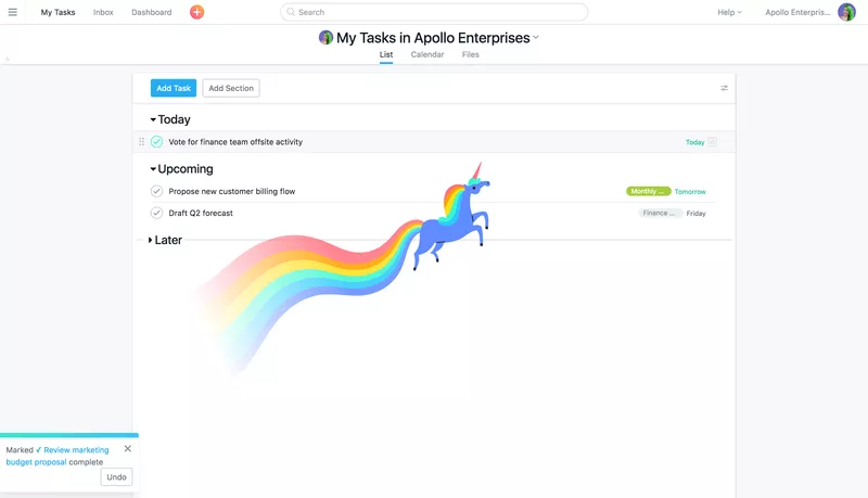 To that end, Asana artfully tapped into that joy. Enter Asana’s “Celebration Creatures” – Unicorn, Narwhal, Phoenix, Yeti, and Otter. The creatures appear (and fly off) the screen as you complete tasks. They are the PM equivalent of that purple-ink smiley face from your first-grade teacher. And, just in case the creatures rub you the wrong way, you have the option to turn them off in settings. Again, Asana is tuned in to customer needs.