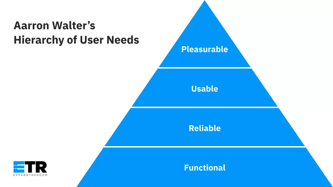 They point to Aarron Walter’s Hierarchy of User Needs. (We’ve included it below as a reminder.) In short, it says that while it can be tempting to want to add pleasurable bits to your experience, don’t try to apply them when you have not covered the bases on functionality, reliability, and usability.
