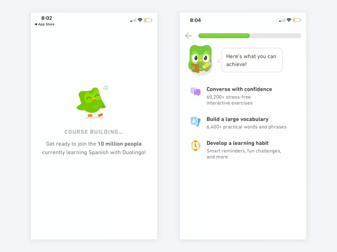 During Duolingo’s onboarding, the app builds a customized course for the user that’s created in response to a brief questionnaire. A cute animated owl accompanies every page load or task completion offering words of encouragement like “way to go!!” or “almost there, you got this!!” that not only makes it fun while you wait, but feels like you have a funny friend helping you get through class.