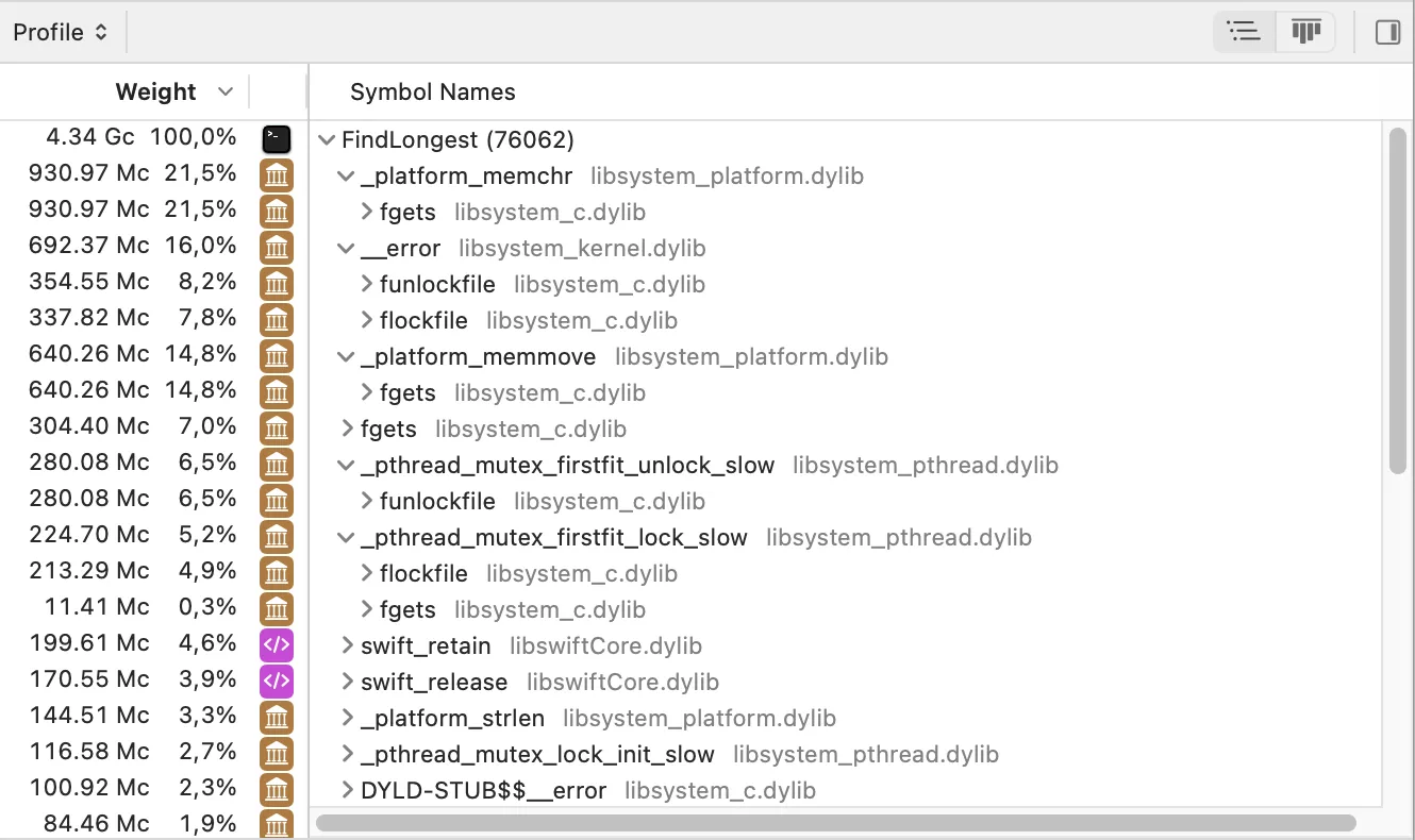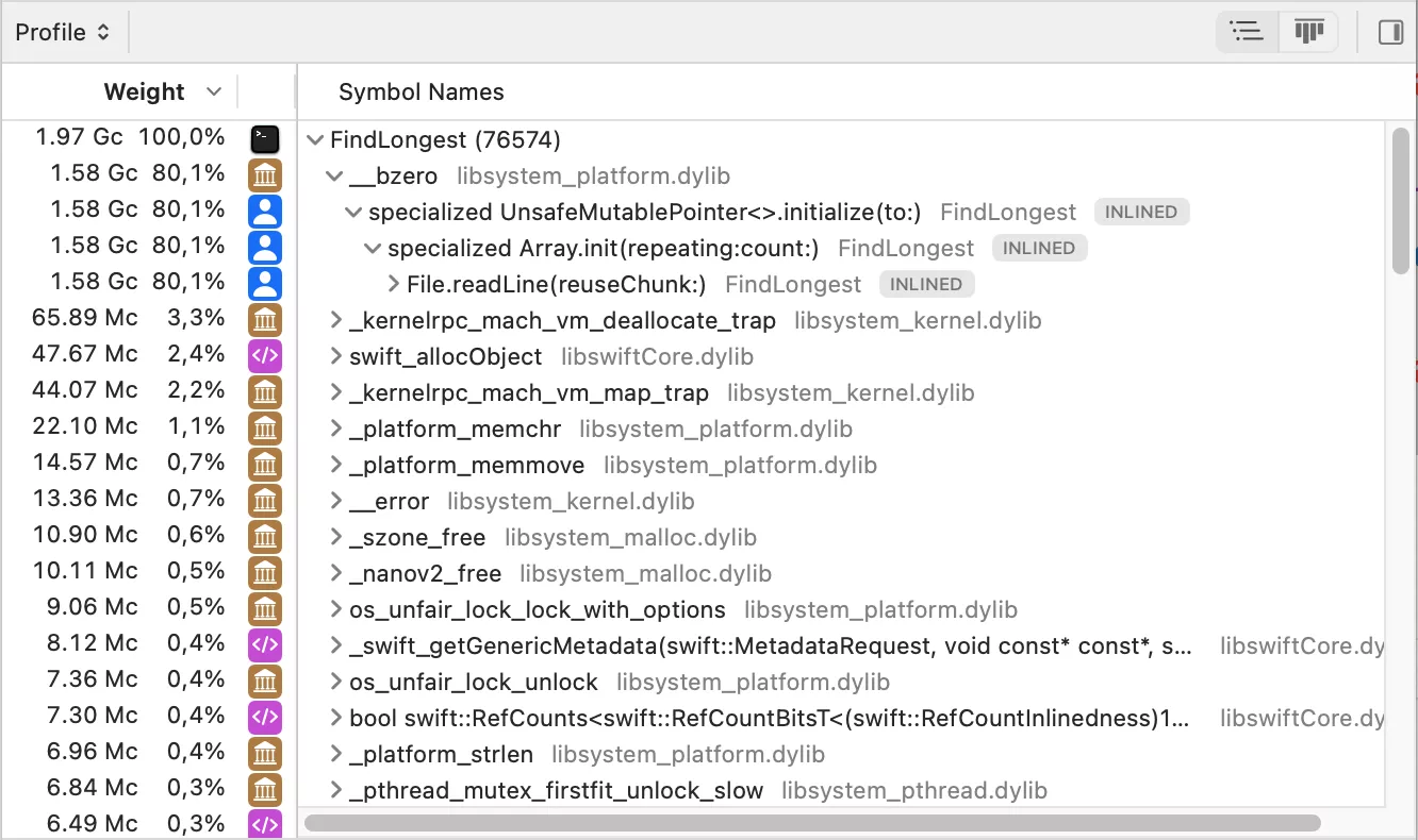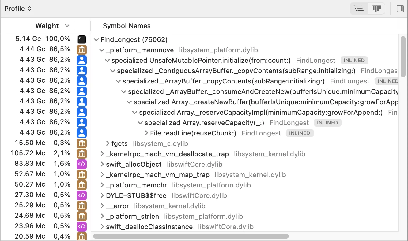 This reduces the memory allocation cost but surfaces a new issue: the Array type in Swift is a copy-on-write (CoW) data type, and whenever we find a new longest line, the whole array will be copied.