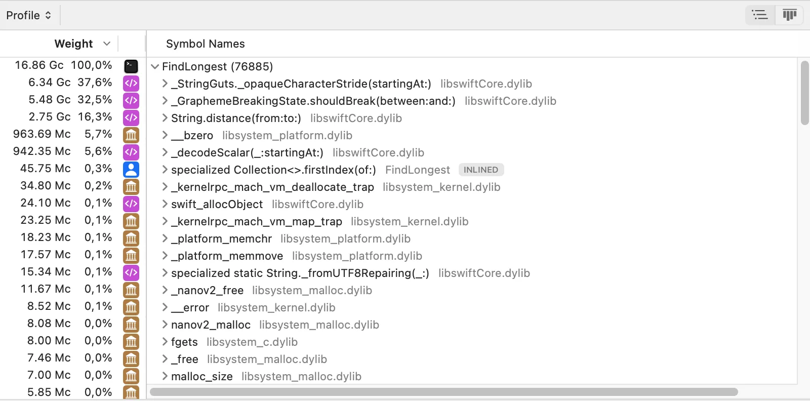 We can see that over 90% of the time is spent in functions related to String handling, which is somewhat expected. Swift’s Strings are very powerful, but that power comes at a cost.
