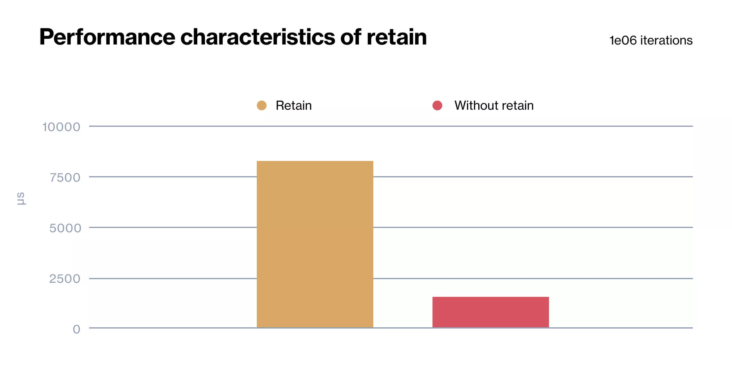 Keep in mind that this only demonstrates the performance impact of retain. When we retain an object, we usually need to release it, making the impact even more significant.