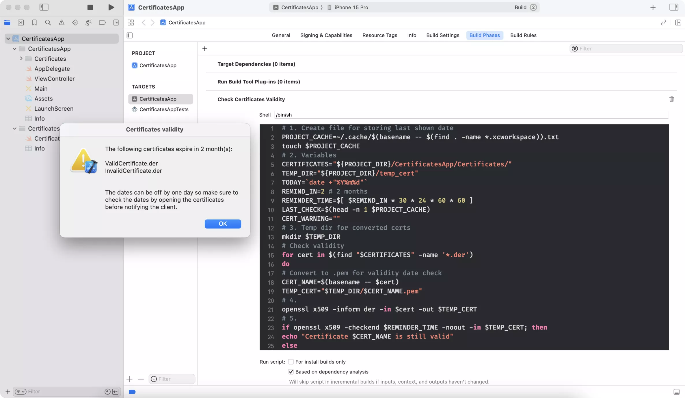 In your project, go to the Build Phases and add the New Run Script Phase named Check Certificates Validity.