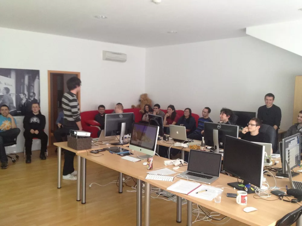 At a certain point, we realized we needed to change that, so we started organizing internal meetings where we would talk about things we’ve done and what we’ve learned. Six of us crammed in a small room and it was basically a discussion about Git Flow and Android development in general. I remember ranting about how Eclipse is shit and why we should all switch to Android Studio.