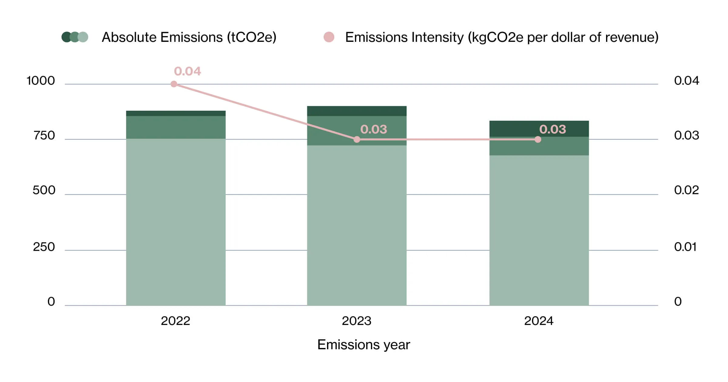 Understanding our impact is the first step toward reducing it. In 2024, our total carbon footprint amounted to 819 tCO₂e — a reduction compared to the previous two years. To arrive at this number, we included all emissions associated with delivering our services, from office energy consumption and hardware use to business travel, employee commuting, and supply chain activities.