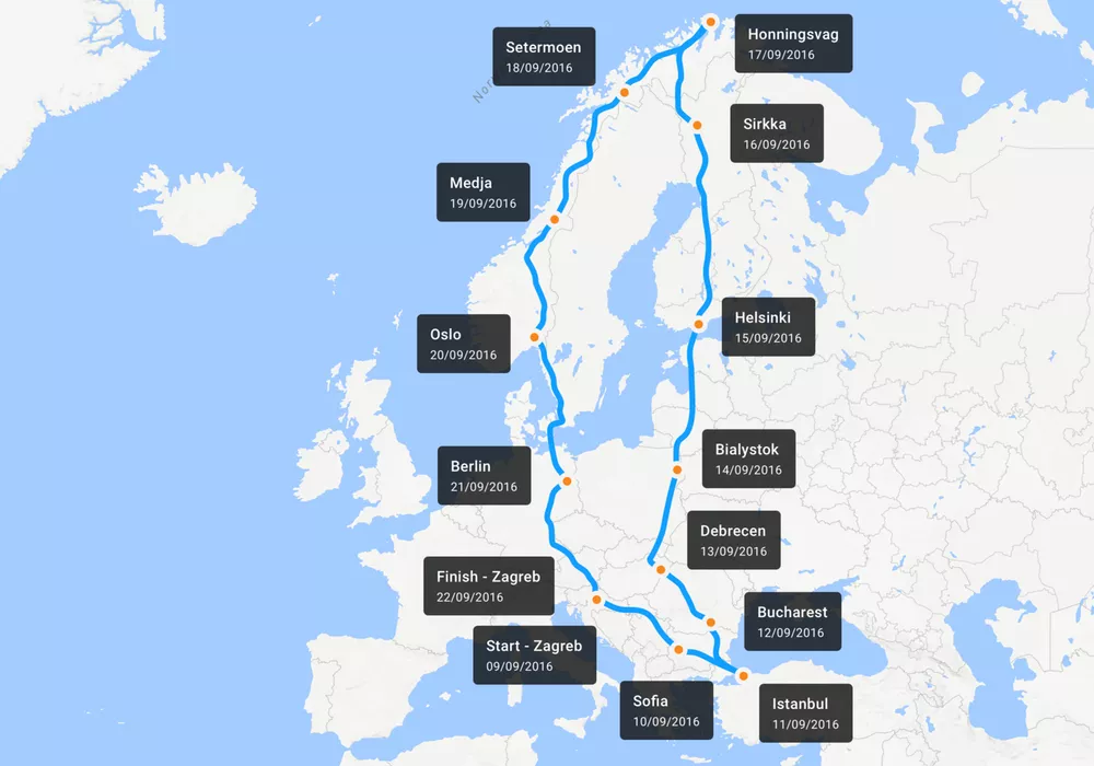Is Saša speeding? Keep track of his speed and gearbox. You can also check how much of the planned route is covered. Zagreb is the starting and finishing point, making it a journey more than 10.000 km long.