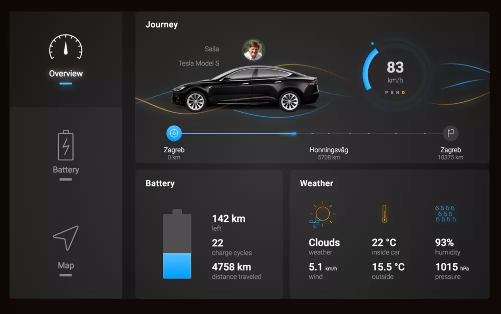 The weather section also gives a bit of context for the overall status. For instance, if the weather conditions are comfortable, there is no need to turn on the air conditioning, so Saša can save up on battery consumption.