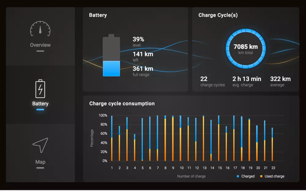 The Battery section is packed with useful details concerning energy consumption. If the car is currently on a charger, you’ll see the current charging time and how long until the battery is full. Hover over the graphs for even more details on charging locations, charging times and battery use between consecutive charges.