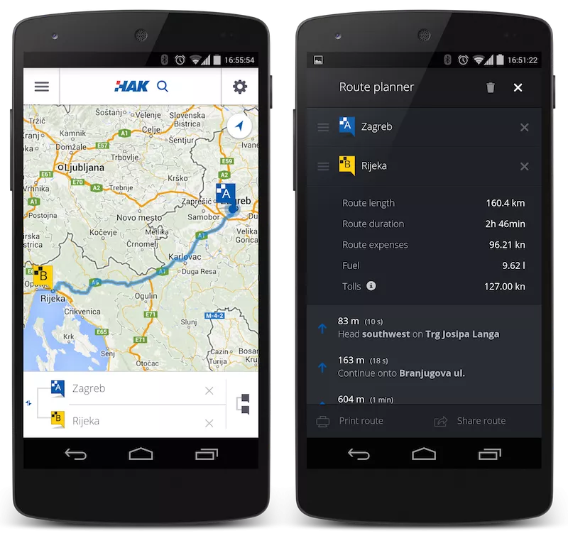 One of the great features of HAKmap is the possibility to plan a route for your journey and get additional information about your trip. The map will give you the exact steps and route advice, tell you the length of your route, how much time it will take to get from the start to the end and total expenses, including your estimated fuel consumption and toll prices.
