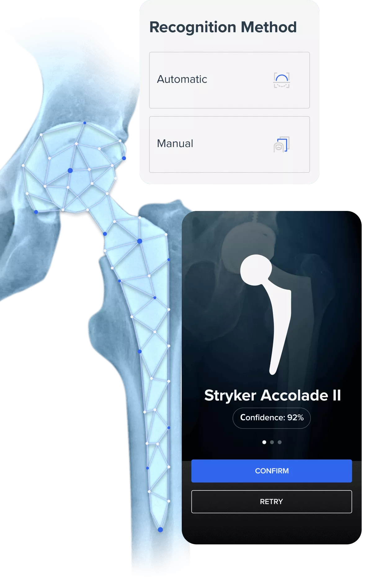 The image is run through an artificial neural network, cross-referencing the photo against a crowd-sourced database of implant silhouettes.