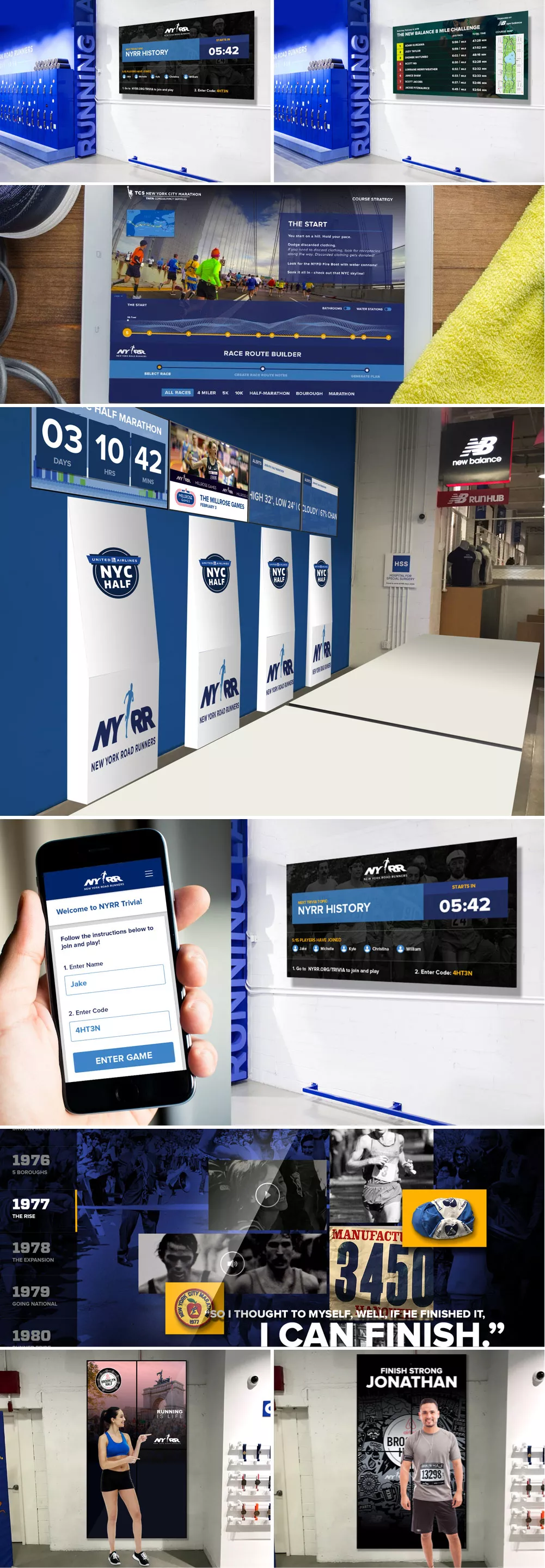 Recognizing that the solution was more than just replacing interactive touchscreen content, we worked with NYRR team stakeholders to understand New York Road Runners and its mission and members. We worked on concepts for the screens that would engage runners no matter the functional role the NYRR RUNCENTER was serving.