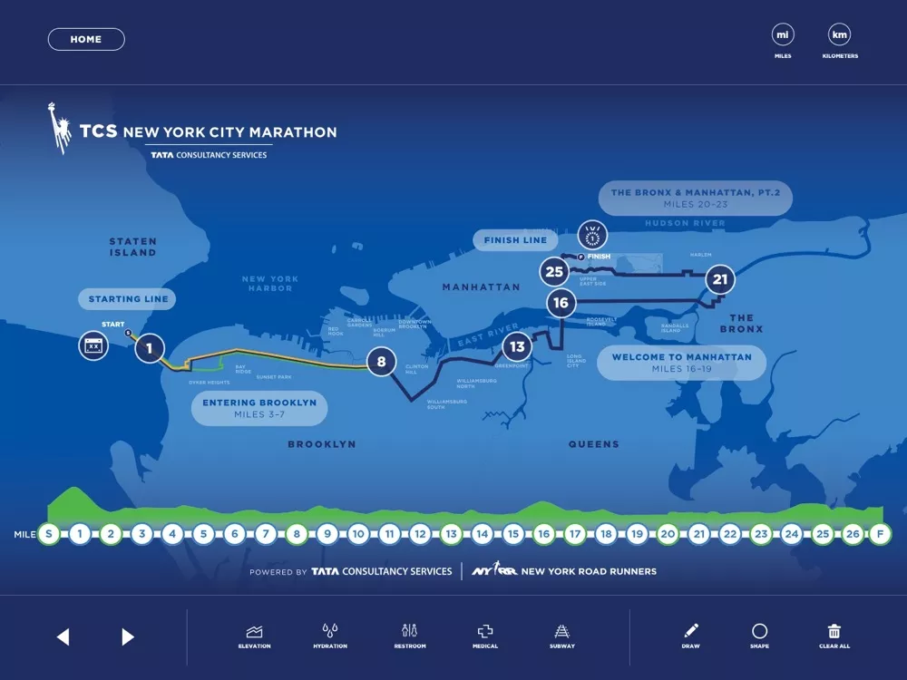 Our attempt to increase engagement, flexibility, and scalability didn’t end in the NYRR RUNCENTER. NYRR also asked us to take a look at the Course Strategy presentations coaches give before the TCS New York City Marathon. The existing Course Strategy tool was a presentation coaches displayed on jumbotron screens at convention centers to walk crowds of runners through what they might expect in their upcoming race.